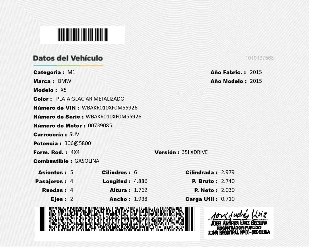 • BMW X5 XDRIVE 35I 2015 • MOTOR A GASOLINA TURBO 3.0 L DE 6 CILINDROS EN LÍNEA • POTENCIA DE 306 HP / 5.800RPM Y 400 NM DE TORQUE • ACELERACIÓN DE 0 A 100 KM/H EN 6.5 SEGUNDOS Y VELOCIDAD MÁXIMA DE 235 KM/H • TRANSMISIÓN AUTOMÁTICA SECUENCIAL DE 8 VELOCIDADES CON PADDLE SHIFT • TRACCIÓN PERMANENTE (AWD-XDRIVE) • 4 MODOS DE CONDUCCIÓN (COMFORT, ECO PRO, SPORT, SPORT+) • FRENOS DE DISCO VENTILADOS EN LAS 4 RUEDAS CON SISTEMA ABS, EBD Y BA • SISTEMA START/STOP Y AUTO-HOLD • CÁMARA DE RETROCESO CON DIAGRAMA DE GIRO • SENSORES DE PROXIMIDAD DELANTEROS Y POSTERIORES • TIMÓN MULTIFUNCIÓN AJUSTABLE • FAROS Y NEBLINEROS LED CON SENSOR DE ENCENDIDO AUTOMÁTICO • DIRECCIÓN ASISTIDA ELECTRÓNICAMENTE • CLIMATIZADOR BI-ZONA CON VENTILACIÓN INDEPENDIENTE EN 2DA FILA • CONTROL DE CRUCERO Y LIMITADOR DE VELOCIDAD • BUTACAS CON AJUSTE ELECTRÓNICO • 8 AIRBAGS (FRONTAL, LATERAL, CORTINA) • MALETERA CON APERTURA ELECTRÓNICA DE DOBLE PORTÓN • ESPEJOS LATERALES BIFOCALES CON DIRECCIONAL LED INTEGRADA • 2 FILAS DE ASIENTOS TAPIZADOS EN CUERO DAKOTA • 2DA FILA CON ANCLAJES ISOFIX Y ABATIBLES • RIELES DE TECHO PARA ADAPTAR PORTAEQUIPAJES • ESTRIBOS DE ACCESO CONFORTABLE ORIGINALES • SET DE PISOS DE JEBE HOMOLOGADOS (4 PIEZAS) • ASISTENCIA EN ASCENSO Y DESCENSO DE PENDIENTES PRONUNCIADAS • LUNAS, PESTILLOS Y RETROVISORES ELÉCTRICOS CON MANDO CENTRAL • LÁMINAS DE SEGURIDAD MK91 • PANTALLA TÁCTIL HOMOLOGADA CON FUNCIONES: RADIO, AUX, USB, BLUETOOTH, NETFLIX, WAZE, GOOGLE MAPS, YOUTUBE, ETC. • LLANTAS POWER TRAC RACING PRO (285/35 R21-DELNATERAS) - (325/30 R21-POSTERIORES) • AROS DE ALEACIÓN 21” BI-TONO • HERRAMIENTAS ORIGINALES, MANUALES Y 2 LLAVES CODIFICADAS