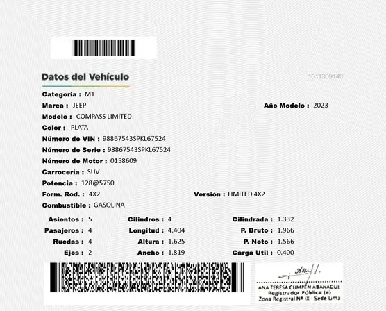 • 100% FACTURABLE • JEEP COMPASS LIMITED 2023 • MOTOR A GASOLINA 1.3 LT DE 4 CILINDROS EN LÍNEA - TURBO. • POTENCIA DE 175 HP / 6.000RPM / 270 NM DE TORQUE. • TRANSMISIÓN AUTOMÁTICA SECUENCIAL DE 6 VELOCIDADES CON PADDLE SHIFT. • TRACCIÓN DELANTERA 4X2. • FRENOS DE DISCO EN LAS 4 RUEDAS CON SISTEMA (ABS). • FRENO DE PARQUEO ELECTRÓNICO CON FUNCIÓN DE DETENCIÓN AUTOMÁTICA (AUTO/HOLD). • FAROS Y NEBLINEROS CON ILUMINACIÓN LED Y SENSOR AUTOMÁTICO. • TIMÓN MULTIFUNCIÓN CON AJUSTE EN ALTURA, PROFUNDIDAD Y COMANDOS DE AUDIO. • CONTROL DE CRUCERO ADAPTATIVO CON FUNCIÓN STOP&GO • ASISTENCIA DE PUNTO CIEGO, TRAFICO CRUZADO, CAMBIO INVOLUNTARIO DE CARRIL • ASISTENTE DE FRENADO PRE-COLISIÓN (PANIC BRAKE ASSIST) CON DETECTOR DE SEÑALES DE TRÁNSITO • ASISTENTE DE ESTACIONAMIENTO SEMI-AUTOMÁTICO PARK ASSIST® • DIRECCIÓN ASISTIDA ELECTRÓNICAMENTE. • SENSORES DE PROXIMIDAD DELANTEROS, LATERALES Y POSTERIORES. • AIRE ACONDICIONADO BI-ZONA CON VENTILACIÓN POSTERIOR. • AIRBAGS (FRONTAL, LATERAL, CORTINA Y RODILLA). • TAPICERÍA DE CUERO DE FÁBRICA CON 2 FILAS DE ASIENTOS PARA 5 OCUPANTES. • MALETERA CON APERTURA CIERRE ELECTRÓNICO AMPLIO ESPACIO DE ALMACENAMIENTO. • CORTINA DE PRIVACIDAD DE MALETERA CON SENSOR DE MOVIMIENTO PARA APERTURA SIN MANOS • BUTACAS DELANTERAS CON REGULACIÓN ELECTRÓNICA • ASIENTOS POSTERIORES ABATIBLES CON ANCLAJES ISOFIX. • LUNAS, PESTILLOS Y RETROVISORES ELÉCTRICOS CON MANDO CENTRAL. • PUERTO DE CARGA INALÁMBRICA PARA TELÉFONOS COMPATIBLES • PANTALLA TÁCTIL DE 10.1” CON FUNCIONES: RADIO, AUX, USB, BLUETOOTH. • CONECTIVIDAD APPLE CAR PLAY - ANDROID AUTO (INALÁMBRICO). • PARLANTES PREMIUM BEATS® CON SUBWOOFER. • LLANTAS PIRELLI SCORPION (235/45 R19). • AROS DE ALEACIÓN BI-TONO DE 19” EDICIÓN LIMITED. • KIT DE LLANTA DE REPUESTO COMPLETO, MANUALES Y 2 LLAVES ORIGINALES.