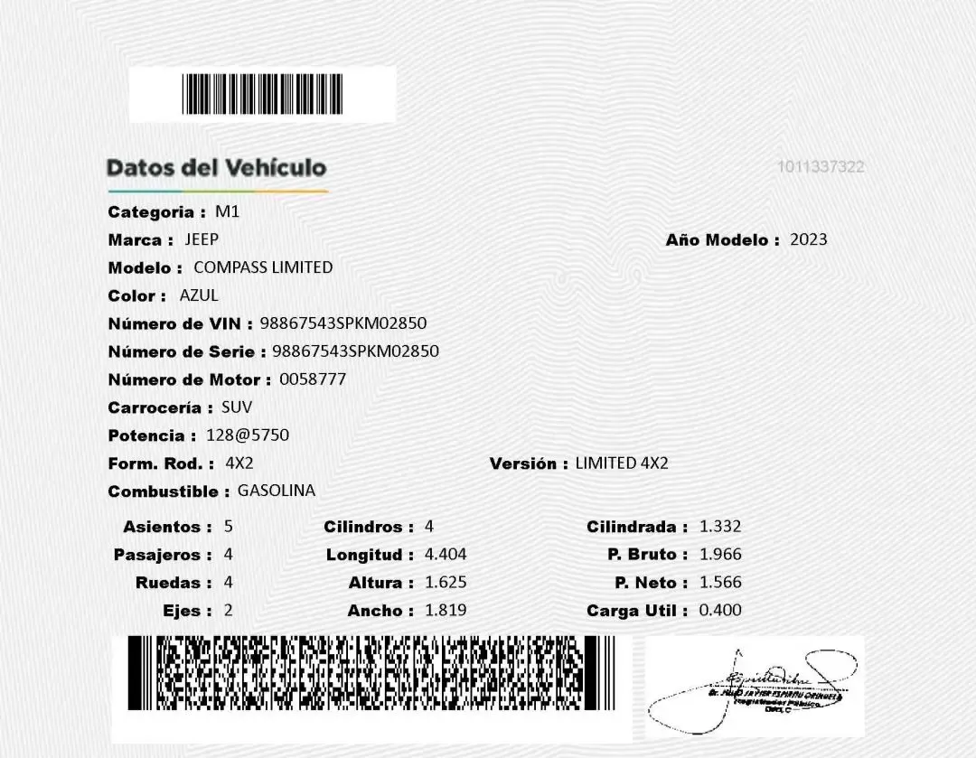 • JEEP COMPASS LIMITED 2023 - FACTURABLE • MOTOR A GASOLINA 1.3 LT DE 4 CILINDROS EN LÍNEA - TURBO. • POTENCIA DE 175 HP / 6.000RPM / 270 NM DE TORQUE. • TRANSMISIÓN AUTOMÁTICA SECUENCIAL DE 6 VELOCIDADES CON PADDLE SHIFT. • TRACCIÓN DELANTERA 4X2. • FRENOS DE DISCO EN LAS 4 RUEDAS CON SISTEMA (ABS). • FRENO DE PARQUEO ELECTRÓNICO CON FUNCIÓN DE DETENCIÓN AUTOMÁTICA (AUTO/HOLD). • FAROS Y NEBLINEROS CON ILUMINACIÓN LED Y SENSOR AUTOMÁTICO. • TIMÓN MULTIFUNCIÓN CON AJUSTE EN ALTURA, PROFUNDIDAD Y COMANDOS DE AUDIO. • CONTROL DE CRUCERO ADAPTATIVO CON FUNCIÓN STOP&GO • ASISTENCIA DE PUNTO CIEGO, TRAFICO CRUZADO, CAMBIO INVOLUNTARIO DE CARRIL • ASISTENTE DE FRENADO PRE-COLISIÓN (PANIC BRAKE ASSIST) CON DETECTOR DE SEÑALES DE TRÁNSITO • ASISTENTE DE ESTACIONAMIENTO SEMI-AUTOMÁTICO PARK ASSIST® • DIRECCIÓN ASISTIDA ELECTRÓNICAMENTE. • SENSORES DE PROXIMIDAD DELANTEROS, LATERALES Y POSTERIORES. • AIRE ACONDICIONADO BI-ZONA CON VENTILACIÓN POSTERIOR. • AIRBAGS (FRONTAL, LATERAL, CORTINA Y RODILLA). • TAPICERÍA DE CUERO DE FÁBRICA CON 2 FILAS DE ASIENTOS PARA 5 OCUPANTES. • MALETERA CON APERTURA CIERRE ELECTRÓNICO AMPLIO ESPACIO DE ALMACENAMIENTO. • CORTINA DE PRIVACIDAD DE MALETERA CON SENSOR DE MOVIMIENTO PARA APERTURA SIN MANOS • BUTACAS DELANTERAS CON REGULACIÓN ELECTRÓNICA • ASIENTOS POSTERIORES ABATIBLES CON ANCLAJES ISOFIX. • LUNAS, PESTILLOS Y RETROVISORES ELÉCTRICOS CON MANDO CENTRAL. • PUERTO DE CARGA INALÁMBRICA PARA TELÉFONOS COMPATIBLES • PANTALLA TÁCTIL DE 10.1” CON FUNCIONES: RADIO, AUX, USB, BLUETOOTH. • CONECTIVIDAD APPLE CAR PLAY - ANDROID AUTO (INALÁMBRICO). • PARLANTES PREMIUM BEATS® CON SUBWOOFER. • LLANTAS MICHELIN (235/45 R19).