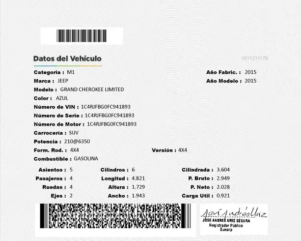 NO SE ENTREGA EL RACK DE BICICLETAS POSTERIOR • JEEP GRAND CHEROKEE LIMITED 2015 • MOTOR A GASOLINA V6 DE 3.6 LT CON POTENCIA DE 290 HP / 352 NM DE TORQUE • TRANSMISIÓN AUTOMÁTICA SECUENCIAL DE 8 VELOCIDADES CON PADDLE SHIFT • TRACCIÓN 4X4 CON SELECTOR DE TERRENO Y REDUCTORA 4WD-LOW • MODO DE CONDUCCIÓN (NIEVE, ARENA, ROCAS, BARRO, AUTOMÁTICO) • ASISTENTE DE PENDIENTES PRONUNCIADAS • FRENOS DE DISCO EN LAS 4 RUEDAS CON SISTEMA ABS Y EBD • SUSPENSIÓN NEUMÁTICA CON SELECTOR DE POSICIÓN ADAPTATIVO (4 POSICIONES) • TIMÓN MULTIFUNCIÓN AJUSTABLE ELECTRÓNICAMENTE • FAROS Y NEBLINEROS CON SENSOR DE ENCENDIDO AUTOMÁTICO • AIRE ACONDICIONADO BI-ZONA • SISTEMA KEY-LESS ENTRY (ACCESO AL AUTO SIN LLAVE) • SISTEMA KEY-LESS GO (ARRANQUE CON BOTÓN) • MODO DE MANEJO ECO • AIRBAGS (FRONTAL, LATERAL Y CORTINA) • SET DE PISOS MOLDEADOS ORIGINALES WEATHERTECH (4 PIEZAS) • LÁMINAS DE SEGURIDAD (PROTEMAX) • TAPICERÍA DE CUERO ORIGINAL (CREMA) • MALETERA CON APERTURA Y CIERRE ELECTRÓNICO • BUTACAS DELANTERAS CON VENTILACIÓN Y CALEFACCIÓN • BUTACA PILOTO CON 2 MEMORIAS DE POSICIÓN • ASIENTOS POSTERIORES ABATIBLES Y CALEFACTABLES CON ANCLAJES ISOFIX • PANTALLAS DE ENTRETENIMIENTO EN 2DA FILA • TECHO PANORÁMICO CON APERTURA Y CORTINA SOLAR • BARRAS DE TECHO HOMOLOGADAS THULE • LUNAS Y PESTILLOS ELÉCTRICOS CON MANDO CENTRAL • CÁMARA DE RETROCESO CON DIAGRAMA DE GIRO • SENSORES DE PROXIMIDAD DELANTEROS Y POSTERIORES • COMPARTIMIENTO PORTA OBJETOS EN MALETERA • TOPE DE REMOLQUE CON CONEXIÓN PARA TRÁILER ORIGINAL • RETROVISORES RETRACTILES ELECTRÓNICAMENTE • SISTEMA DE AUDIO ENVOLVENTE DE 8 PARLANTES CON SUBWOOFER • PANTALLA TÁCTIL DE ENTRETENIMIENTO ORIGINAL • FUNCIONES: RADIO, AUX, USB, NAVEGACIÓN, BLUETOOTH • LLANTAS BRIDGESTONE DUELER H/T (265/60 R18) • AROS DE ALEACIÓN 18” ORIGINALES